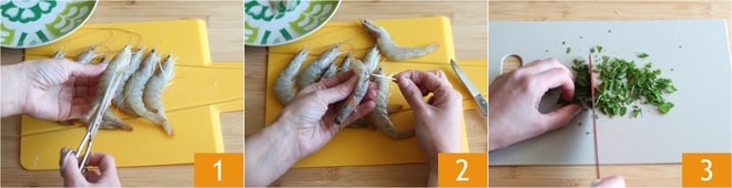 Um die Pfannengarnelen zuzubereiten, beginnen Sie mit dem Reinigen der Garnelen: Schneiden Sie mit einer Schere die Beinchen ab 1, entfernen Sie dann vorsichtig den Panzer, wobei Sie den Schwanz und den Kopf der Garnele intakt lassen. Mit einem Zahnstocher ziehen Sie den schwarzen Faden, den Darm, heraus 2. Waschen und hacken Sie mit einem Messer eine Handvoll Petersilie und stellen Sie diese beiseite 3.