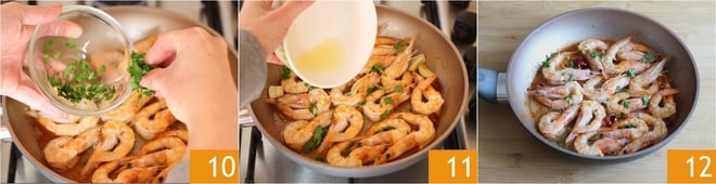 Würzen Sie mit einer Prise Salz, der gehackten Petersilie 10 und dem Zitronensaft 11, kochen Sie noch für ein paar Minuten weiter. Servieren Sie die Pfannengarnelen heiß 12.