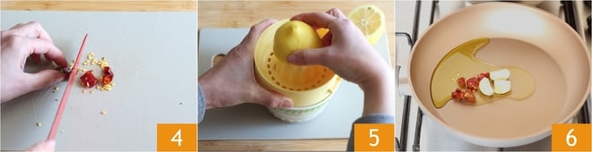 Schneiden Sie die Chili in Ringe 4, Sie können entscheiden, ob Sie die Samen behalten möchten oder nicht. Pressen Sie den Saft einer Zitrone aus 5. Erhitzen Sie nun das Öl in der Pfanne, braten Sie dann den geschälten Knoblauch und die Chili an 6.