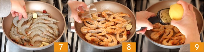 Nach einigen Augenblicken legen Sie die Garnelen in die Pfanne 7 und braten sie bei starker Hitze 2 Minuten auf jeder Seite. Löschen Sie mit dem Brandy ab 8, neigen Sie die Pfanne leicht und lassen Sie die Flamme brennen, bis sie von selbst erlischt. Fügen Sie die abgeriebene Zitronenschale hinzu 9.