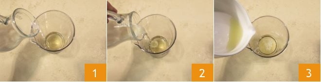 Um die Garnelen mit Kokos zuzubereiten, beginnen Sie mit der Zubereitung der Begleitsaucen. In das Glas eines Mixers geben Sie das Pflanzenöl 1, die Sojamilch 2 und den ausgepressten und gefilterten Limettensaft 3.