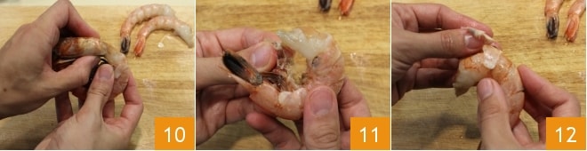 Kümmern Sie sich nun um die Reinigung der Garnelen (alternativ können Sie auch Kaisergranate verwenden): Entfernen Sie die Köpfe, indem Sie leichten Druck mit den Händen zwischen Kopf und Körper ausüben 10, dann entfernen Sie die Beinchen 11 und ziehen Sie das Fleisch aus dem Panzer 12, ohne jedoch den Schwanz abzutrennen.
