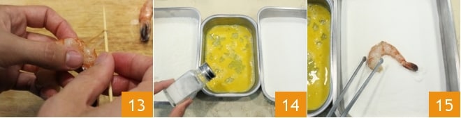 Entfernen Sie den Darm, der sich auf dem Rücken befindet, indem Sie sich mit einem Zahnstocher oder der Spitze eines kleinen Messers helfen 13. Dann nehmen Sie sich 3 Backbleche, die Sie nebeneinander stellen: In das erste gießen Sie das Reismehl, im zweiten brechen Sie die Eier auf und schlagen sie und im dritten legen Sie das Kokosmehl. Sobald die Eier geschlagen wurden, salzen Sie sie nach Belieben 14 und rollen Sie jede Garnele im Reismehl 15.