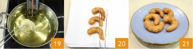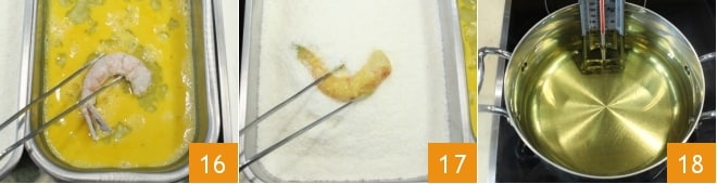 Nachdem sie bemehlt wurden, tauchen Sie die Garnelen in das geschlagene Ei 16 und schließlich in das Kokosmehl 17. Zu diesem Zeitpunkt gießen Sie das Pflanzenöl in einen hohen Topf und erhitzen es, bis das Öl gut heiß ist und eine Temperatur von 170-180° erreicht hat (Sie können dies mit einem Küchenthermometer überprüfen) 18.