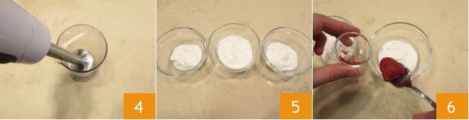 Fügen Sie eine Prise Salz hinzu und pürieren Sie alles mit einem Stabmixer 4, bis die Mischung eindickt. Teilen Sie die so erhaltene Sauce in 3 kleine Schüsseln 5. Lassen Sie eine natürlich (sie wird Ihre falsche Mayonnaise sein) und aromatisieren Sie die anderen zwei. In eine geben Sie das Tomatenmark 6,