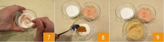 indem Sie mit einem Teelöffel umrühren, um die Mischung gut zu vermischen 7. Beginnen Sie mit der Zubereitung der zweiten Sauce, indem Sie in die letzte Schüssel den roten Thai-Curry geben 8 und alles vermischen: Ihre 3 Saucen sind bereit 9.