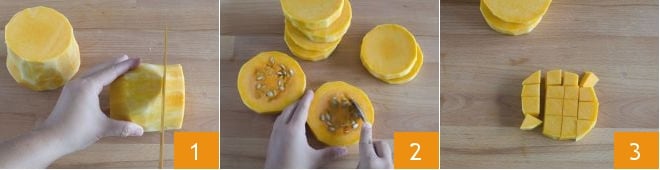 Um die Garnelen mit Orange auf Kürbiscreme zuzubereiten, entfernen Sie als Erstes die Schale des Kürbisses, dann schneiden Sie ihn in etwa 2 cm dicke Scheiben 1, entfernen die Kerne und inneren Fasern 2 und schneiden ihn in Würfel 3.