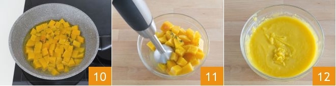 Wenn der Kürbis gar ist 10, geben Sie ihn in eine Schüssel, entfernen Sie überschüssiges Wasser und pürieren Sie ihn mit einem Stabmixer 11 bis eine glatte und homogene Creme entsteht 12.