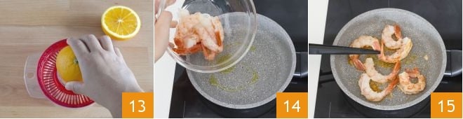Jetzt drücken Sie die Orange aus, um den Saft zu gewinnen 13 und kümmern Sie sich um das Kochen der Garnelen: Erhitzen Sie das Olivenöl in einer Pfanne, geben Sie die Garnelen hinzu 14 und braten Sie sie jeweils ein paar Minuten pro Seite an 15,