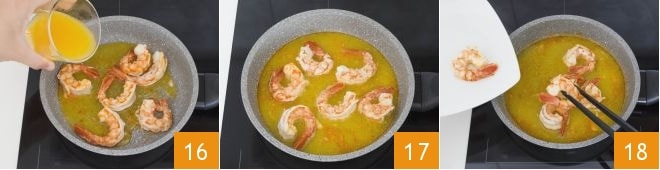 dann gießen Sie den Orangensaft hinzu 16 und lassen Sie es bei schwacher Hitze für etwa weitere 5 Minuten kochen 17. Nach dieser Zeit nehmen Sie die Garnelen heraus und lassen den Saft in der Pfanne 18, dann richten Sie an.