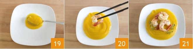 Verteilen Sie die Kürbiscreme auf jedem Teller 19 und legen Sie 3 Garnelen darauf 20, garnieren Sie mit frischem Thymian und servieren Sie Ihre Garnelen mit Orange auf Kürbiscreme 21!