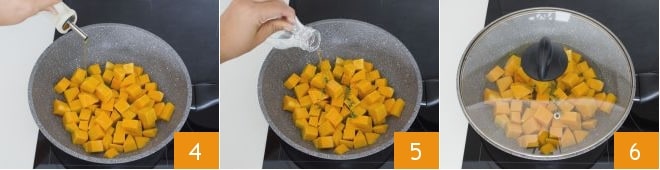 Geben Sie den Kürbis in eine große Pfanne, fügen Sie einen Schuss Öl 4, Salz, frische Thymianblättchen und Wasser 5 hinzu, decken Sie mit einem Deckel ab 6 und lassen Sie es bei mittlerer Hitze etwa 20 Minuten kochen.
