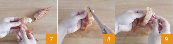 In der Zwischenzeit widmen Sie sich dem Reinigen der Garnelen: Entfernen Sie den Kopf und den Panzer 7, lassen Sie nur den Schwanz dran, dann schneiden Sie den Rücken mit einem scharfen Messer ein 8 und entfernen mit einem Zahnstocher den schwarzen Faden im Inneren 9. Spülen Sie sie zuletzt unter fließendem Wasser ab.