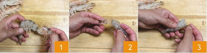 Um das Garnelenomelett zuzubereiten, beginnen Sie damit, die Garnelen gründlich unter fließendem Wasser abzuspülen. Entfernen Sie dann den Kopf, indem Sie Druck ausüben und mit den Fingern ziehen 1. Fahren Sie fort, indem Sie alle Schalen entfernen und das Fleisch aus dem Panzer ziehen 2. Nehmen Sie dann ein kleines Messer und machen Sie einen Schnitt entlang des Rückens der Garnele, um den inneren Darm zu entfernen 3. Um zu erfahren, wie Sie diese Operation am besten durchführen, können Sie unsere Kochschule konsultieren: wie man Garnelen reinigt.