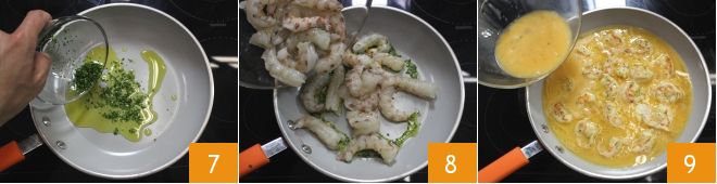 Nehmen Sie eine Antihaftpfanne, erhitzen Sie das Öl und geben Sie die gehackte Mischung aus Knoblauch, Petersilie und Schalotten hinein 7 und lassen Sie es einige Sekunden anbraten. Geben Sie die gereinigten und geschälten Garnelen in das Bratöl 8 und braten Sie sie bei mittlerer Hitze etwa 5 Minuten an, bis sie leicht rosa werden. Nach dieser Zeit geben Sie die verquirlten Eier in die Pfanne 9 und neigen Sie die Pfanne, damit die Mischung die gesamte Oberfläche des Kochgeschirrs bedeckt.