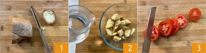 Um den andalusischen Gazpacho zuzubereiten, schneiden Sie zuerst das altbackene Brot in Stücke 1, legen Sie es in eine Schüssel und bedecken Sie es mit 150 g Wasser 2. Lassen Sie es einige Minuten einweichen, während Sie den Rest der Zutaten vorbereiten: Waschen und schneiden Sie die Tomaten in Scheiben 3.