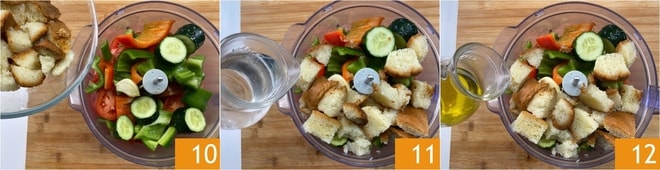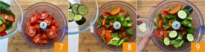 Geben Sie die Tomaten in einen Mixer, dann fügen Sie die Paprika 7, die Gurken 8 und die Knoblauchzehe 9 hinzu.