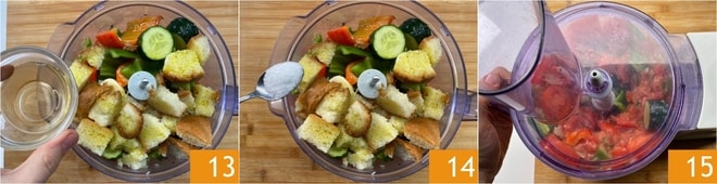 Zuletzt fügen Sie den Essig 13, das Salz 14 und den Pfeffer hinzu. Schließen Sie den Mixer und mixen Sie für etwa 30 Sekunden 15.