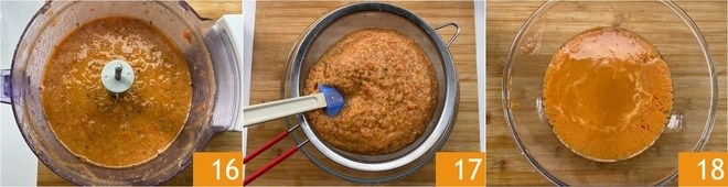 Wenn Sie eine homogene Mischung erhalten haben 16, geben Sie sie in ein feines Sieb, das Sie über eine Schüssel gelegt haben, und drücken Sie mit einem Spatel, um sie zu sieben 17. Auf diese Weise entfernen Sie die Schalenreste und erhalten eine glatte und flüssige Konsistenz 18. Lassen Sie es mindestens 2 Stunden im Kühlschrank ruhen, abgedeckt mit Folie.