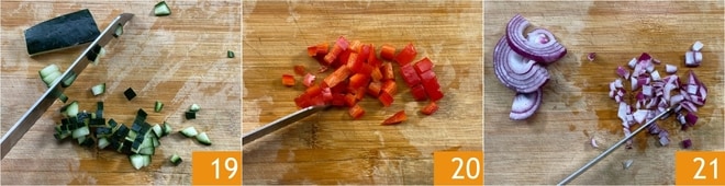 Nach der Ruhezeit bereiten Sie die Zutaten für die Dekoration vor: Schneiden Sie die Gurke 19, die Tomate 20 und die rote Zwiebel 21 in Würfel.