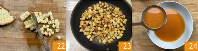 Schneiden Sie auch das Brot in Würfel 22 und rösten Sie es in der Pfanne 23. Jetzt nehmen Sie den Gazpacho aus dem Kühlschrank und geben ihn in die Teller 24.