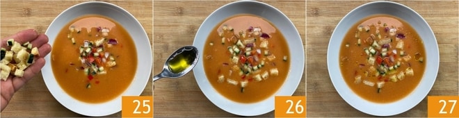 Garnieren Sie mit dem Gemüse und den gerösteten Brotwürfeln 25, dann würzen Sie mit einem Schuss Öl 26 und einer Prise Pfeffer. Ihr andalusischer Gazpacho ist bereit zum Genießen 27!