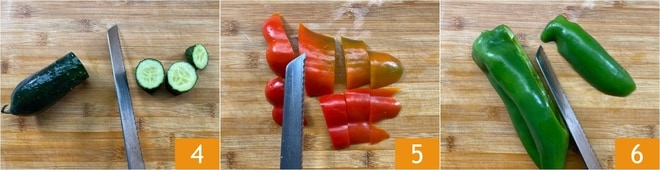 Verfahren Sie ebenso mit den Gurken, ohne sie zu schälen 4. Schließlich die Paprika reinigen und in Stücke schneiden, sowohl die roten 5 als auch die grünen 6.