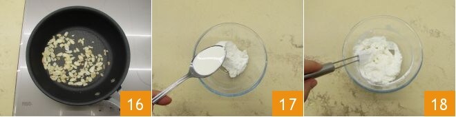 Rösten Sie die Mandeln einige Minuten in einer kleinen Pfanne und legen Sie sie beiseite 16. Bereiten Sie abschließend eine Käsecreme zu, indem Sie die Sahne 17 mit Ziegenkäse vermischen, gut verrühren und in einen Spritzbeutel füllen 18.