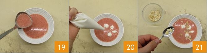 Gießen Sie die Mischung in einen tiefen Teller 19 und garnieren Sie mit ein paar Klecksen Ziegenkäse 20, den Mandelblättchen 21