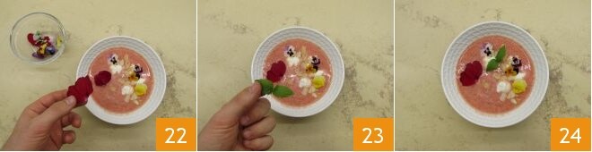 und ein paar essbaren Blumen 22. Schließlich ein Minzblatt 23 und voilà, Ihr Gazpacho mit Wassermelone ist bereit, servieren Sie ihn kalt 24!