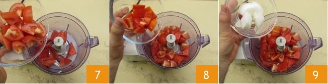 Geben Sie alles in den Mixer: Wassermelone, Tomaten 7, Paprika 8 und die Zwiebel 9.