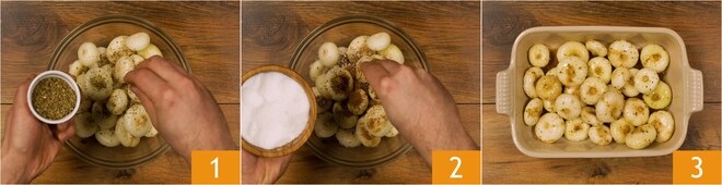 Um die Frühlingszwiebeln im Ofen zuzubereiten, legen Sie die zuvor geschälten Borettane-Zwiebeln in eine große Schüssel. Fügen Sie den Apfelessig, den braunen Zucker und den Oregano hinzu 1. Geben Sie eine Prise Salz dazu 2 und einen großzügigen Schuss Öl. Mischen Sie alles gut und geben Sie es in eine Auflaufform 3. Backen Sie es im vorgeheizten statischen Ofen bei 180° für 50 Minuten. Nehmen Sie es aus dem Ofen, lassen Sie es abkühlen und servieren Sie Ihre gebackenen Frühlingszwiebeln mit dem Kochsaft.