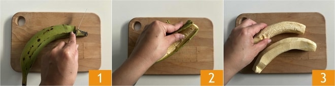 Um die gebackene Kochbanane zuzubereiten, sollten Sie zuerst an die Reinigung der Kochbanane denken. Schneiden Sie die Enden der Kochbanane ab 1, dann schneiden Sie die Schale an verschiedenen Stellen ein, damit Sie sie leicht schälen können 2, entfernen Sie die Schale, indem Sie sich bei Bedarf mit einem Messer helfen, bis sie vollständig geschält ist 3.