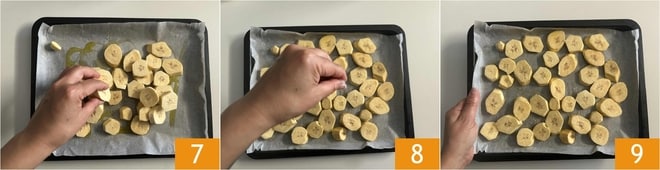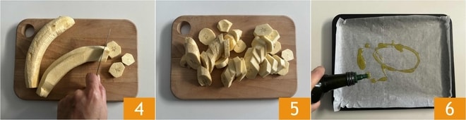 Sobald Sie die Kochbanane gereinigt haben, schneiden Sie sie in nicht zu dünne Scheiben 4, etwa einen halben cm dick. Nachdem Sie beide Kochbananen geschnitten haben 5, legen Sie ein Backblech mit Backpapier aus und geben etwas Olivenöl auf den Boden 6.
