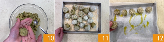 Geben Sie die Mischung in eine Schüssel, nehmen Sie kleine Portionen und formen Sie die Bällchen 10; mit diesen Mengen erhalten Sie etwa 20 Stück. Wälzen Sie die Bällchen in den restlichen Semmelbröseln, um sie gut zu bedecken 11, dann legen Sie sie auf ein mit Backpapier ausgelegtes und mit etwas Öl bestrichenes Blech 12.