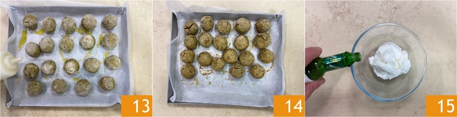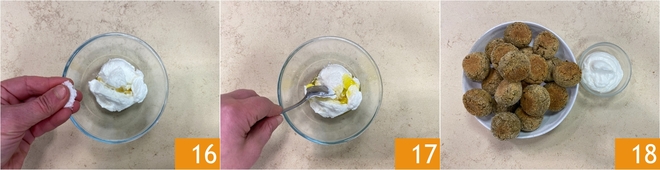 Mit Salz abschmecken 16 und einen Schuss Öl hinzufügen, dann gut vermischen 17, bis eine homogene Creme entsteht. Servieren Sie die gebackenen Linsenbällchen heiß, begleitet von der scharfen Joghurtsauce 18!