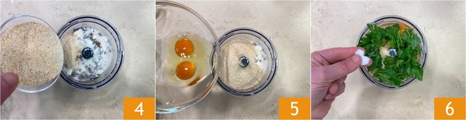 Fügen Sie 100 g Semmelbrösel 4 und die Eier hinzu 5. Vervollständigen Sie mit der Petersilie, dann mit Salz und Pfeffer abschmecken 6.