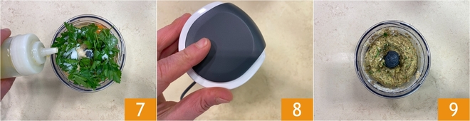 Würzen Sie mit einem Schuss Olivenöl extra vergine 7. Schließen Sie den Mixer 8 und mixen Sie, bis eine homogene, aber nicht zu feine Mischung entsteht 9.