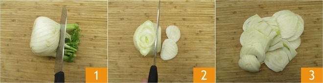Um die panierten Fenchel im Ofen vorzubereiten, reinigen Sie sie, indem Sie den oberen Teil 1 entfernen (dies kann für eine Brühe verwendet werden). Entfernen Sie auch die erste Schicht. Schneiden Sie sie in etwa 0,5 cm dicke Scheiben 2; schneiden Sie den Fenchel, indem Sie ihn aufrecht auf die Arbeitsfläche stellen, so bleiben die Scheiben zusammen 3.