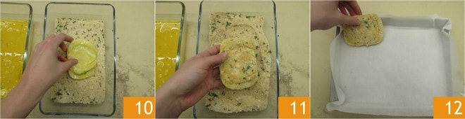 Dann geben Sie sie in die Schüssel mit den Semmelbröseln 10 und wenden Sie sie, damit sie auf beiden Seiten gut haften 11. Legen Sie sie nach und nach auf ein mit Backpapier ausgelegtes Backblech 12.