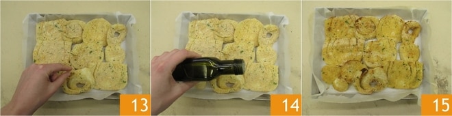 Fahren Sie auf diese Weise fort, bis der Fenchel aufgebraucht ist, und versuchen Sie, ihn nicht zu sehr zu überlappen, wenn Sie ihn auf das Backblech legen 13. Beträufeln Sie ihn mit etwas Öl 14 und backen Sie ihn im vorgeheizten statischen Ofen bei 220°C für 15-20 Minuten. Nehmen Sie ihn aus dem Ofen und servieren Sie Ihren Fenchel 15.