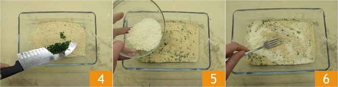 Jetzt kümmern Sie sich um die Panade. Hacken Sie die Petersilie und geben Sie sie in eine Schüssel, in die Sie bereits die Semmelbrösel gegeben haben 4. Fügen Sie den geriebenen Käse hinzu 5 und mischen Sie 6.