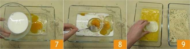 Schlagen Sie die Eier in einer anderen Schüssel auf, geben Sie die Milch hinzu 7, fügen Sie Salz und Pfeffer hinzu und schlagen Sie mit einer Gabel 8. Tauchen Sie eine Fenchelscheibe zuerst in die Eier 9, und stellen Sie sicher, dass sie gut bedeckt ist.