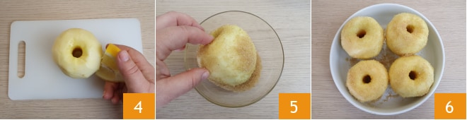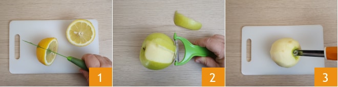 Um das Rezept für im Ofen gebackene Äpfel zuzubereiten, schneiden Sie zuerst die Zitrone in Schnitze und legen Sie sie beiseite 1. Entfernen Sie die Schale der Äpfel mit einem Schäler 2. Entfernen Sie das Kerngehäuse und die inneren Samen 3 mit einem entsprechenden Entkerner und entfernen Sie dann eventuell verbleibende Schalenstückchen mit einem kleinen Messer.