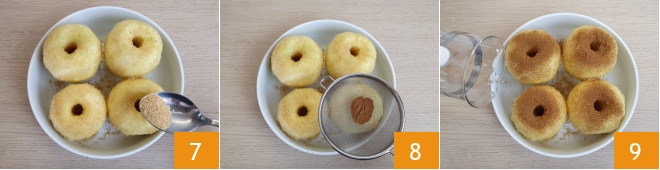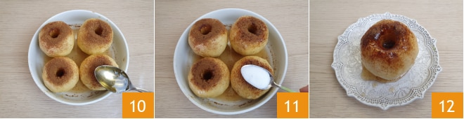 Streuen Sie den restlichen braunen Zucker über die Oberfläche und lassen Sie ihn auch in den inneren Teil des Apfels eindringen 7. Streuen Sie den Zimt mit einem Sieb 8 und geben Sie das Wasser auf den Boden der Auflaufform 9, um zu verhindern, dass die Äpfel kleben oder der Zucker brennt. Backen Sie die Äpfel im vorgeheizten statischen Ofen bei 200°C für 30 Minuten.