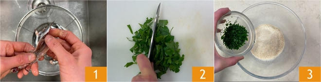 Um die gebackenen Sardellen zuzubereiten, kümmern Sie sich zuerst um die Wie man Sardellen (Anchovis) reinigt: Entfernen Sie den Kopf und die Innereien, dann öffnen Sie sie wie ein Buch und entfernen Sie die Gräte 1. Unter fließendem Wasser abspülen und beiseitelegen. Bereiten Sie nun die Panade zu: Hacken Sie die Petersilie mit einem Messer 2. In einer Schüssel geben Sie die Semmelbrösel und etwa drei Viertel der gehackten Petersilie 3.
