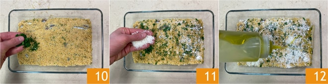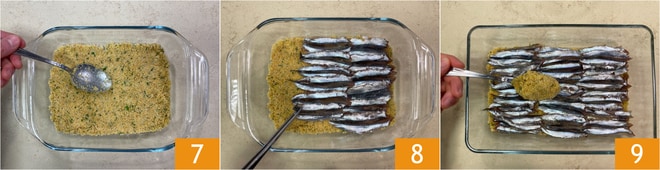 Verteilen Sie die Hälfte der Panade auf dem Boden einer Auflaufform und glätten Sie diese 7. Legen Sie die wie ein Buch geöffneten Sardellen ordentlich darauf 8 und bedecken Sie sie mit der restlichen Panade 9.
