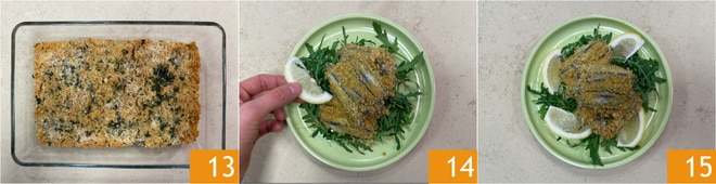 Backen Sie im vorgeheizten Ofen bei 200°C für 20 Minuten 13. Herausnehmen und die Sardellen auf einem Bett aus Rucola anrichten, zusammen mit ein paar Zitronenscheiben 14. Ihre gebackenen Sardellen sind bereit zum Servieren 15!