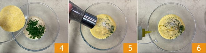 Fügen Sie das Maismehl hinzu 4, würzen Sie mit Salz und Pfeffer 5 und geben Sie einen Schuss Öl hinzu 6. Mischen Sie, um alle Zutaten zu vermengen.