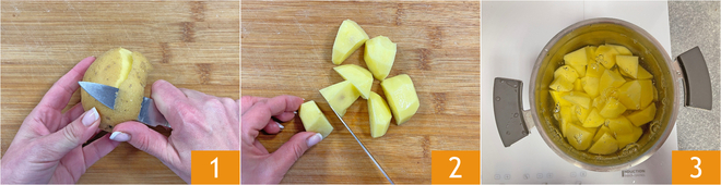 Um gebackenen Kabeljau mit Kartoffeln zuzubereiten, haben wir einen bereits entsalzten Kabeljau verwendet, der nur abgespült werden muss. Beginnen Sie damit, die Kartoffeln zu schälen 1 und in Würfel zu schneiden 2. Bringen Sie Wasser zum Kochen und geben Sie die Kartoffelwürfel für 5 Minuten hinein 3.